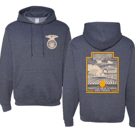 • Item # 996 Unisex Hoodie in Heather Navy with a 1-color front & 2 color back design