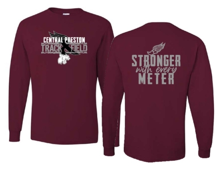 29LS- Unisex Long Sleeve T-shirt in Maroon or Gray with a 3 color design on front 1 color design on back