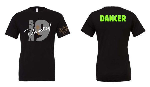#3001-Soft Unisex T-shirt in Black with a 2 Color front design + 1 C Glitter – 1 Color Shoulder Design – 1 Color Back Design
