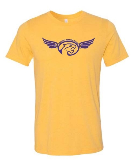 3001 – Unisex t-shirt in Heather Gold, Heather Black or Team Purple with a 1 color front design