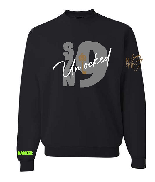 #562-Unisex Crewneck Sweatshirt in Black with a 2 Color front design + 1 C Glitter – 1 Color Shoulder Design – 1 Color Lower Arm Design