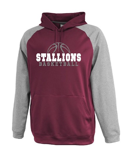 Item # 1720 – Unisex Performance Hoodie in Maroon & Gray with a 2-color design on front