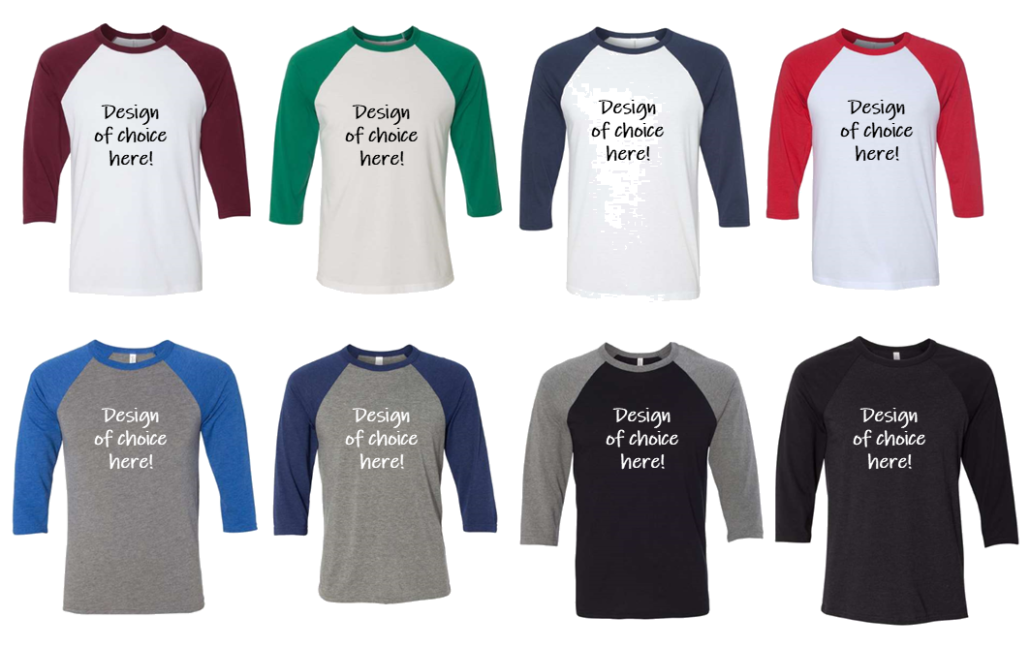 Item #3200 – Unisex 3/4 Sleeve Raglan in your choice of color with a 1 color design of your choice on front