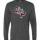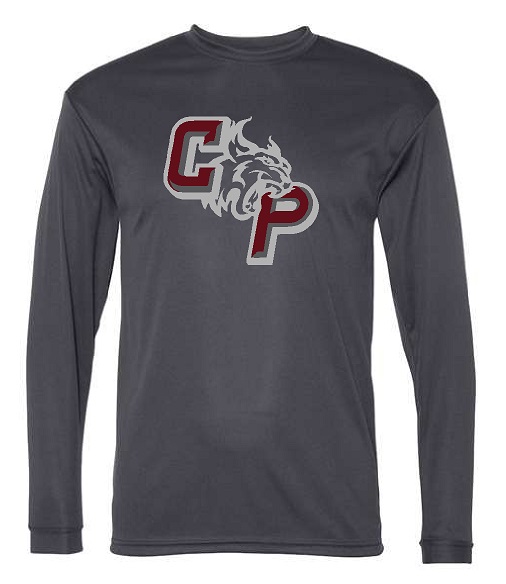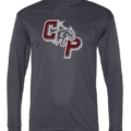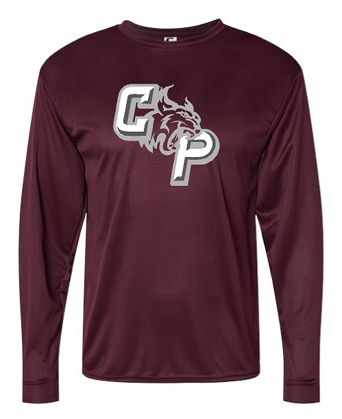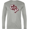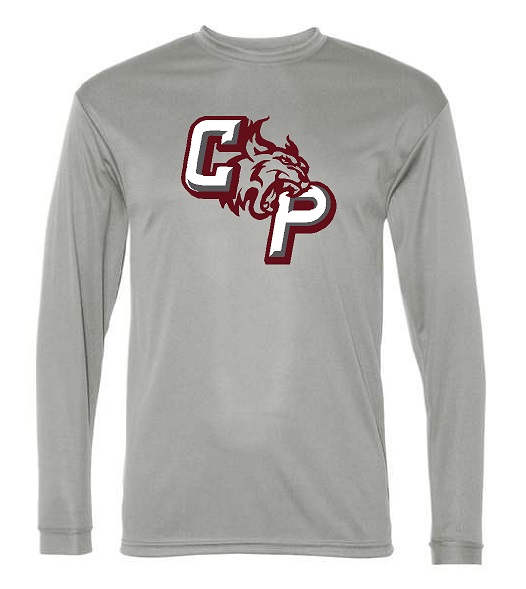 Item # 5104 – Unisex long-sleeved performance t-shirt in Maroon, Graphite or Silver with a 3 color design on front