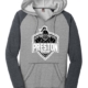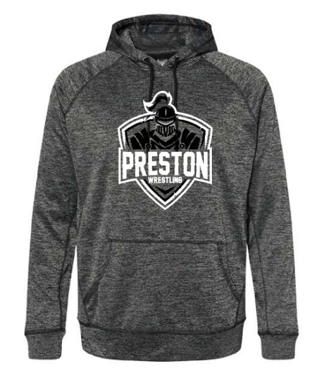 Item # 8670-1 Unisex Performance hoodie in Heather Charcoal with a 2-color front design