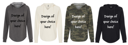 Item #PRM2500 – Womens Hoodie in Black, Bone White, Camo or Shadow Gray with a 1 color design of your choice on front