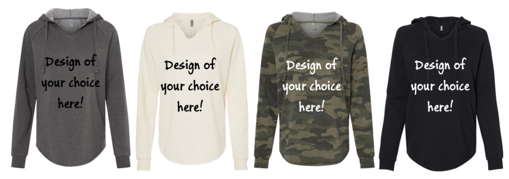 Item #PRM2500 – Womens Hoodie in Black, Bone White, Camo or Shadow Gray with a 1 color design of your choice on front