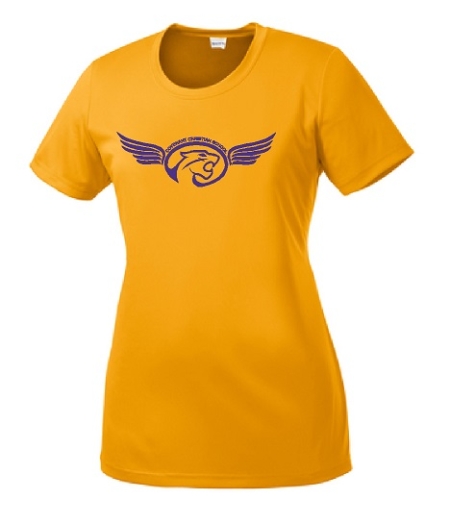 LST350- Women’s V-neck Performance Short Sleeve T-shirt in Black, Gold or Purple with a 1 color front design