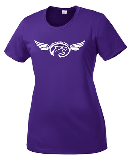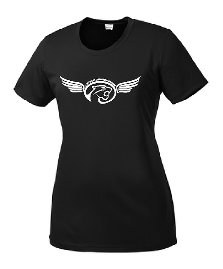 LST350- Women’s V-neck Performance Short Sleeve T-shirt in Black, Gold or Purple with a 1 color front design