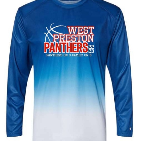 Item # 4204 – Unisex Performance Long sleeved t-shirt in Ombre Graphite or Ombre Royal with a 2 color design on front