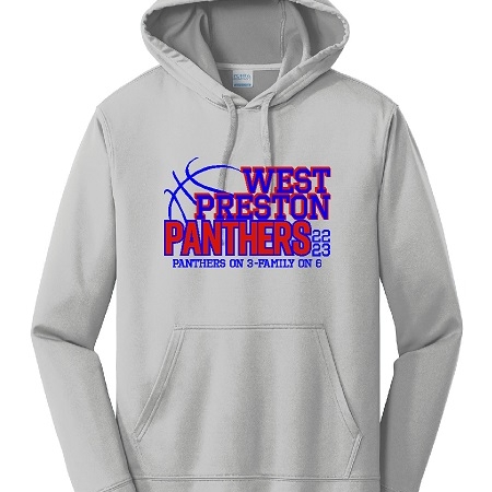 Item # PC590H – Unisex Performance Hoodie in Silver with a 2-color design on front
